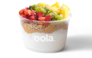 find your center with this tropical harmony of creamy coconut sorbet base layered with peanut butter, almond dust, strawberries, pineapple, coconut, and a drizzle of honey