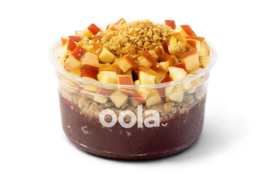 all the joy of a caramel apple in a bowl: açaí base, caramel, paçoca, apples, and drizzled with a little more extra caramel!